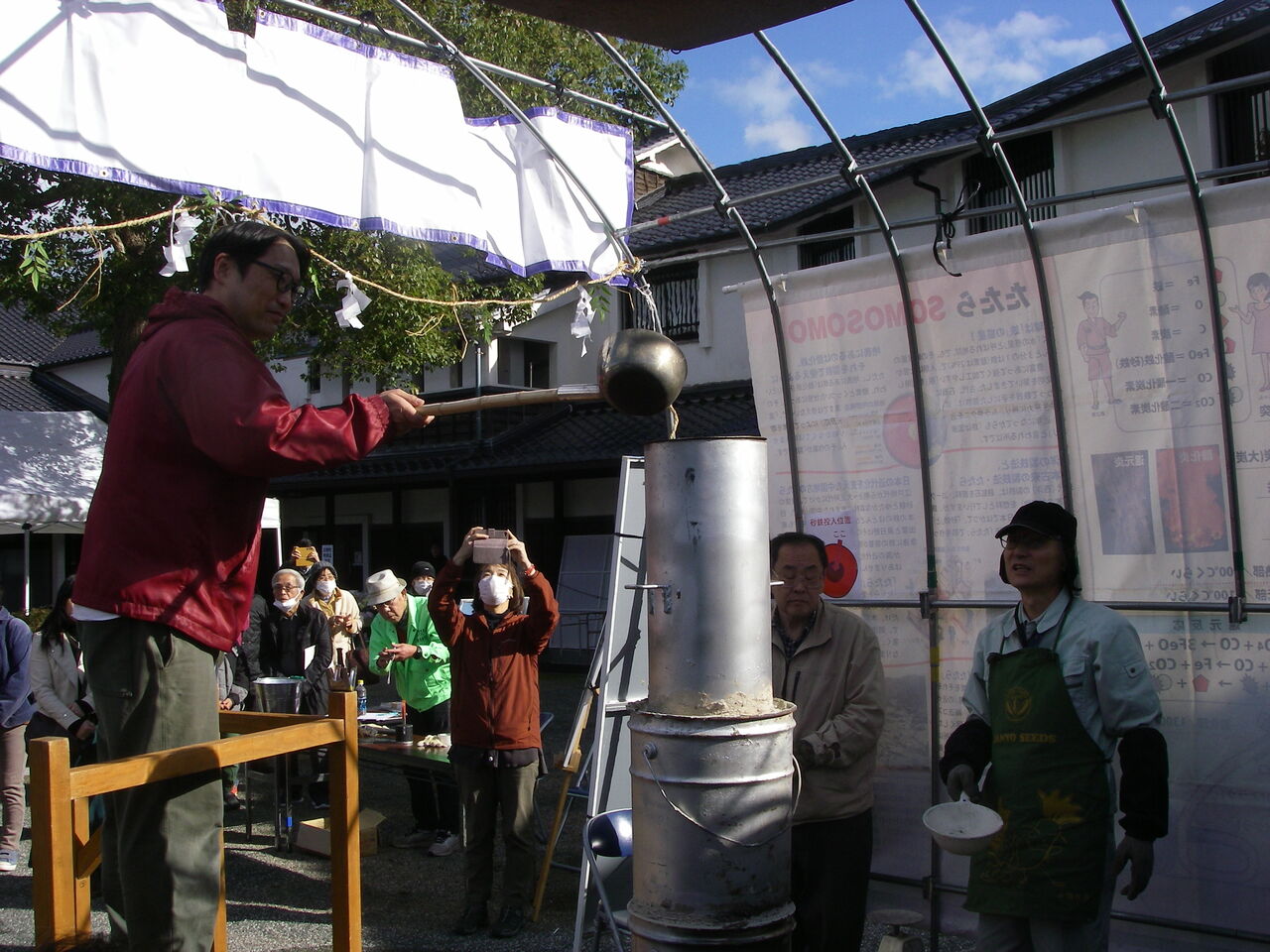 11:50に1回目のノロ出しが行われました。高温の炉内にはケラと呼ばれる鉄の塊ができ、その周りに粘土や砂鉄に含まれる不純物ケイ素が熱で溶解し溜まります。