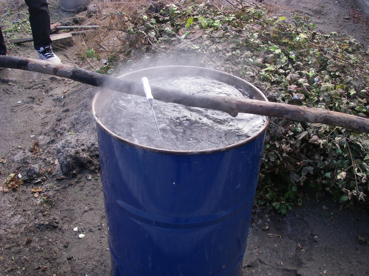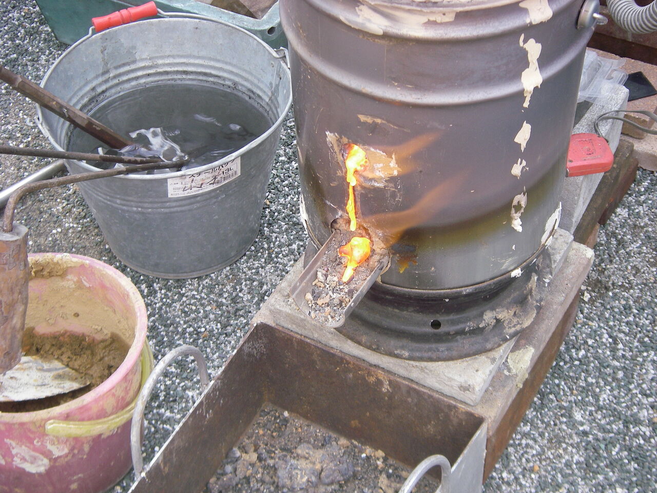 13時に砂鉄投入終了。15Kgの砂鉄と炭40Kgほどを使っています(炭は全部使ったかどうか未確認)。